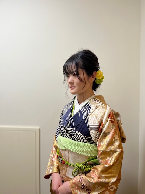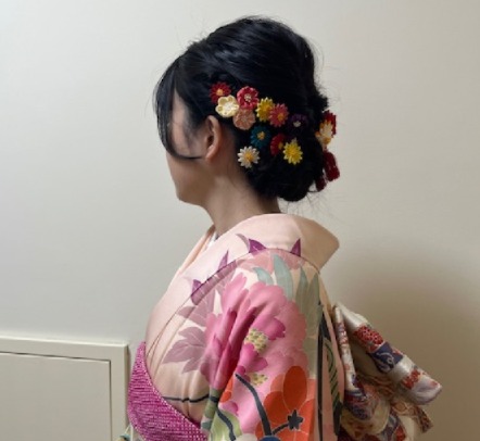 あいにくの雨模様でしたが、式典が終わるころには、お天気になっていましたね。 大街道は、振袖姿でにぎわっていました。 きれいに染めていらして、長く伸ばしているので、今日のスタイルお似合いで