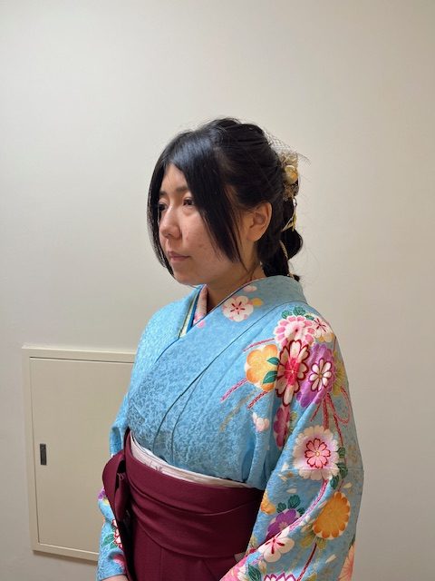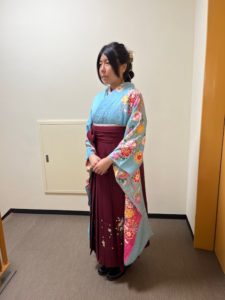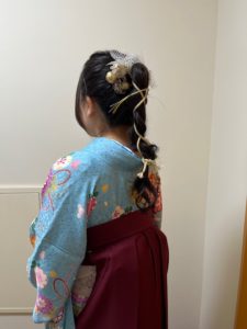 素敵なブリーの着物にエンジの袴、すそには花の刺繍