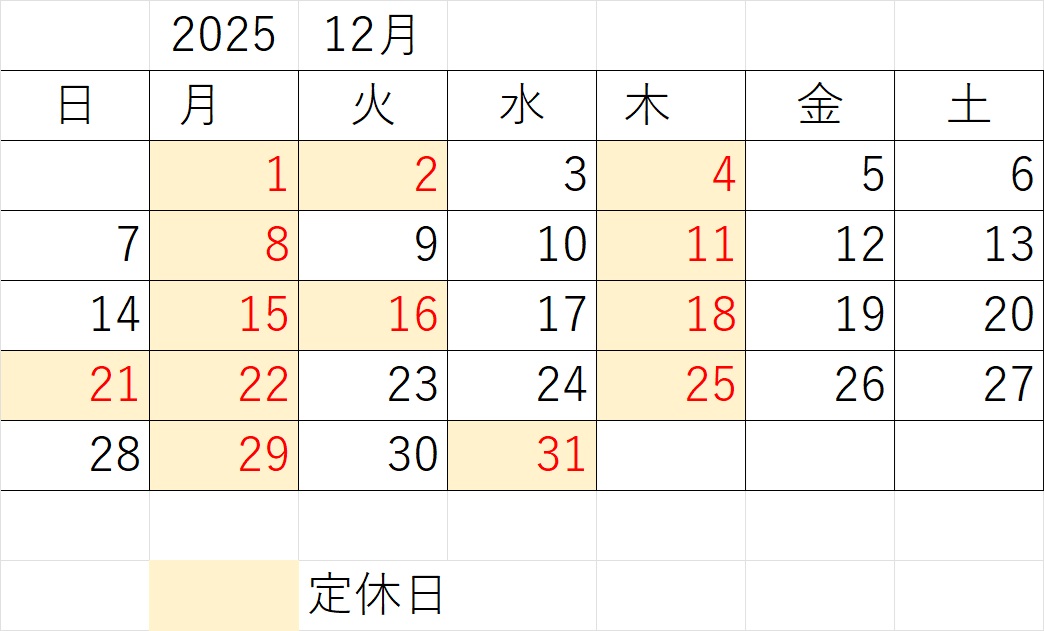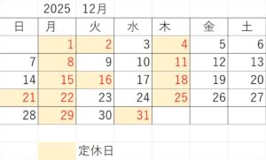 定休日:毎月曜日、毎木曜日、第1・第3火曜日、第3日曜日